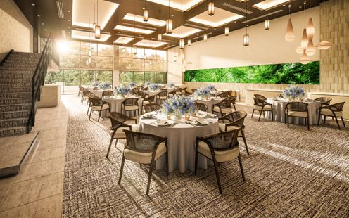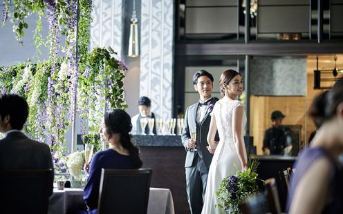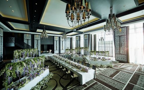 天井高8mの開放感あふれる大空間は、モダンアートが彩り、自然光の差込む洗練されたパーティルーム。ふたりのアイデア次第で生演奏やオリジナルカクテル、シェフによるライブパフォーマンスなど、贅沢なおもてなしウエディングをサポートいたします。