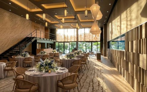 《2026年7月末日までのご結婚式限定》壁や床、椅子や照明にも直線的なモチーフを配した、モダンリビングのようにスタイリッシュなバンケット。階段入場やガーデン付きのアットホームな空間でウェルカムパーティ・グリルビュッフェなどふたりらしい幅広い演出が叶います。
