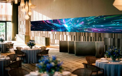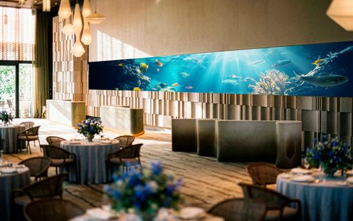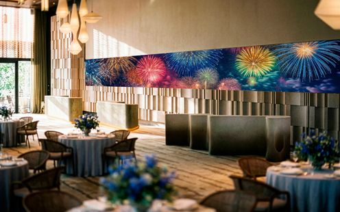モダンな家具と遊び心ある配色を取り入れた、NEW モードな「欧風スタイル」空間。見る角度によって変化する4面の壁など、どこをとっても「絵になる」デザインスペースです。ガーデンを背景にした「メインステージ」を彩るのは、自動昇降式の巨大シャンデリア。セレモニーもパーティも、フォトスポットにも!家具のレイアウトをカスタムして、多様でフレキシブルなスタイルをお楽しみいただけます。パーティ後半は開放的なプールガーデンに繰り出して、フォトジェニックなキッチンカーと記念撮影を!大切なゲストと心ゆくまで楽しいひとときを。