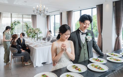 愛媛出身で海外経験を積み、国内ではホテルやレストランでの料理長等の経て現在、料理の監修と調理を任されている専属の料理長がふたりの大切なゲストへおもてなしいたします。シェフ自ら産地や市場に足を運び、味を確かめながら生産者が見える新鮮な食材を使用。各会場のコンセプトに合わせてメニューを用意しており、数々のコンクール受賞シェフが味・見た目・香りまで五感を刺激する絶品料理をお届けします。