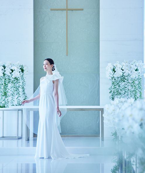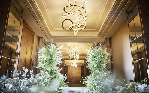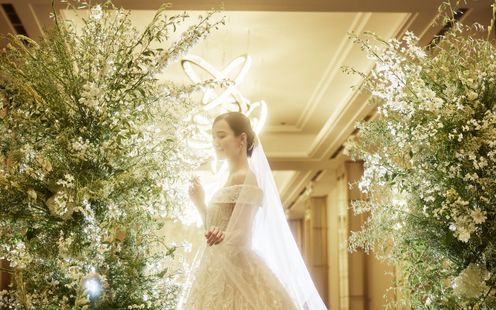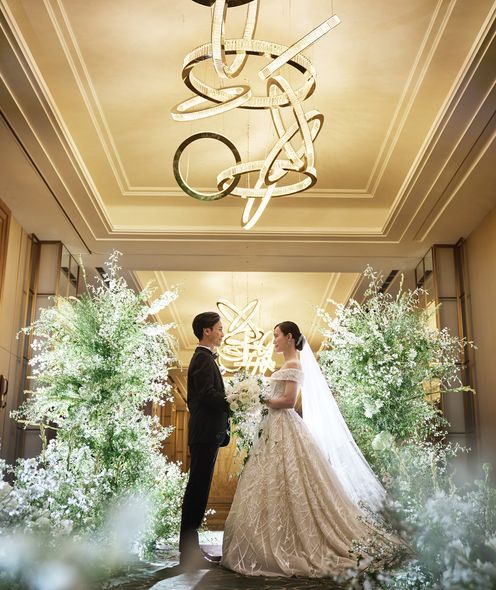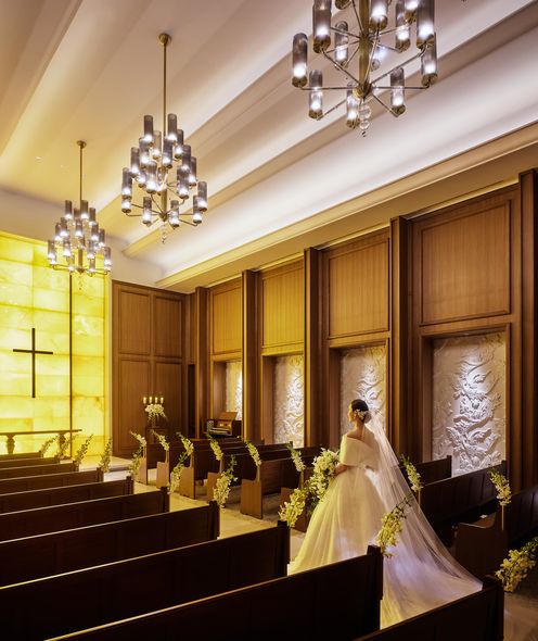 プレステージタワーの7階に位置する「グランドチャペル」は、ヨーロッパの雰囲気漂う厳かな佇まい。高い天井に配された大きなガラスのペンダントライトとウッディなインテリア、イエローオニキスが融合し、ふたりの大切なセレモニーを引き立ててくれます。オークラ東京では、これまでにない体験したことのない特別な新しいセレモニーを実現します。