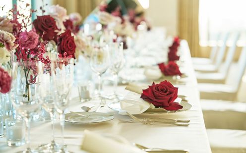 開業時より培われた伝統を受け継ぎながら、時代のニーズに合わせて生み出してきた料理の数々は、国内外の多くのお客さまに好評いただいています。披露宴では美味しい料理でおもてなしをしたいと願うおふたりの希望に応え、どなたにもご満足いただけるメニューを提供しています。最も旬な季節の食材を用いたおふたりだけのメニューはもちろん、コンソメスープやローストビーフなどの愛され続ける逸品を盛り込んだメニューもお選びいただけます。