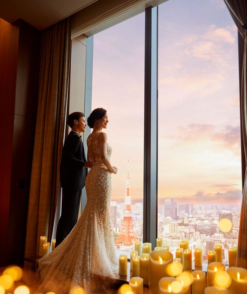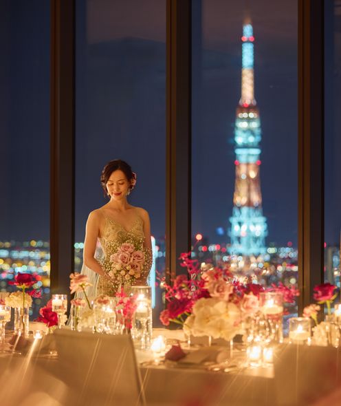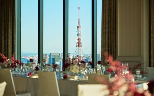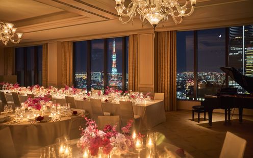〈スカイチャペル〉と同じ、ホテルトップフロアである41階に位置するバンケット。2面の大きな窓からは六本木~赤坂方面、また東京ベイエリアの眺望を一望できます。東京タワーを背景にウェディングケーキ入刀ができるのも魅力。優美な曲線を描くシャンデリアが上品でクラシカルな雰囲気を演出し、開放感溢れるパーティーが叶います。