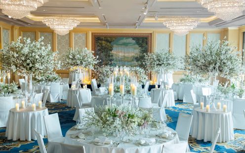ヨーロッパに根付く、貴族をお迎えしおもてなしする「マナーハウス」をモデルにつくられた、クラシカルモダンな光あふれる会場。天井に輝くクリスタルカットビーズのシャンデリアが、ホテルらしい贅沢な空間を演出。濃淡が美しいブルーのカーペットと、壁には英国王室ご用達の職人が手がけたゴブラン織りのタペストリーが祝宴に華を添えます。このタペストリー前での撮影が花嫁にも大人気。同会場がある7階はグランドチャペルや神殿、写場、親族控室、美容室等ご披露宴に関わる全ての施設が集約されており、一日の動線がコンパクトな点も魅力。7階のフロア全体のコンセプトが「西洋の邸宅」をイメージしており、大切なゲストの一日をおもてなしするためにふさわしい会場です。