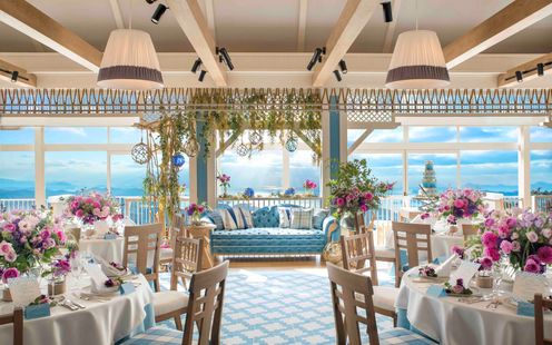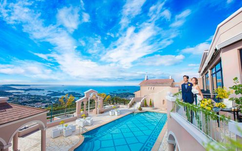 佐世保の街並みや九十九島の緑の島々が広がる絶景のロケーション。丘の上に佇む絶景リゾートホテルでふたりの特別な一日を過ごして。