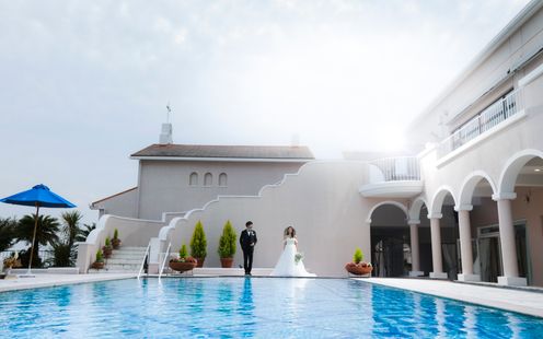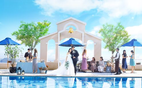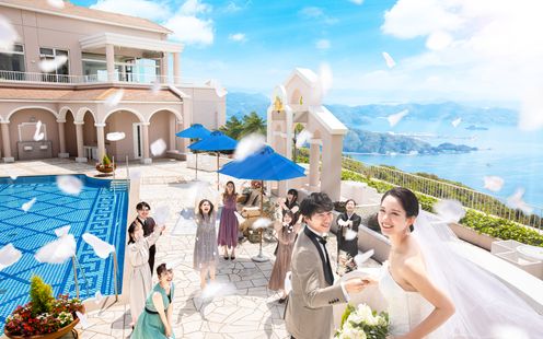 九十九島や佐世保の街並みを一望しながらガーデンプールで挙げる式は、他にはない特別なもの。山の上のリゾートの雰囲気は、ここでしか味わえないセレモニー