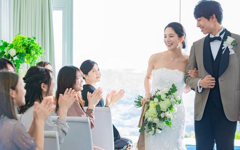父からの愛情を一歩一歩進むたびに感じられるお父様と一緒に歩くロイヤルブルーのバージンロード。そしてその様子を優しく見守ってくれている母への感謝。父からの愛情と母への感謝を感じながら進むバージンロードにはおふたりが進むこれからの未来がきっと見えるはず。