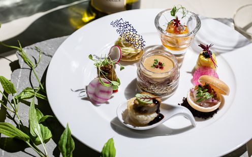 当館自慢のコースは、和のエッセンスが感じられるフランス料理。旬の食材にこだわり、結婚式らしいアーティスティックな逸品の中にも、和のお料理特有の旨味が感じられる、幅広い年齢層に親しまれる料理を提供します。「想い出の味を再現したい」「実家の野菜を使った一品をふるまいたい」こんなふたりの想いを料理で形にするお手伝いもしております。おふたりの結婚式でしか食べられないという特別感をゲストにお届けします。