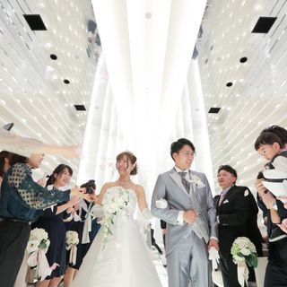 インターネットで調べている時に、真っ白のチャペルに一目惚れしました!実際に見学に行くと、素敵すぎて感動しました!バージンロードは、透明でライトを通すので、長めのウェディングドレスがすごく合います!