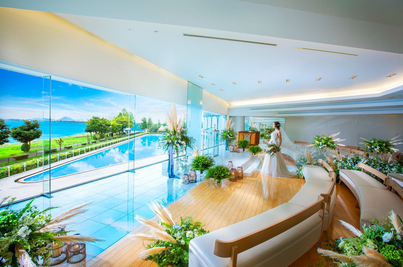 01.<眺望抜群のチャペル>青空とびわ湖のパノラマビューが美しい真っ白なチャペルで感動挙式