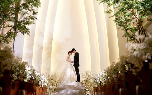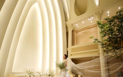 3層吹き抜けの高い天井は高さ12m、バージンロードの長さ25m。2024年、鴨川沿いの自然を感じる独立型大聖堂が誕生。天井高12mの壮大なスケール感をそのままにして、バージンロードには京都の「参道」をイメージした石畳を取り入れ、京都らしさ薫る上質な空間へと生まれ変わります。