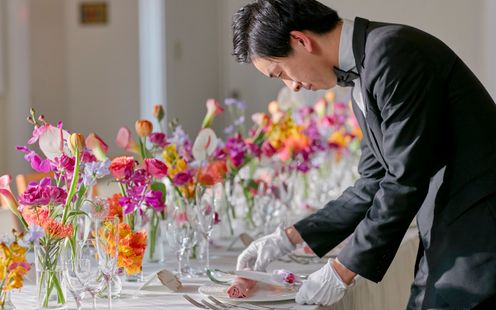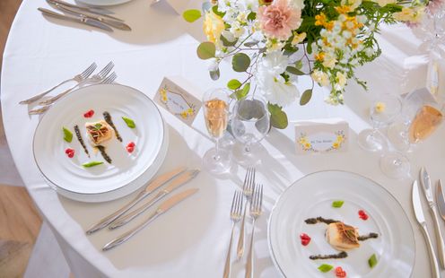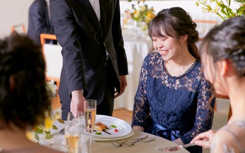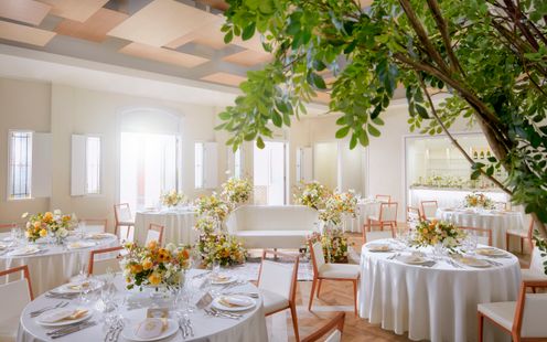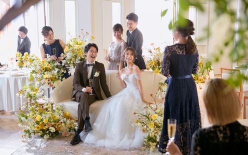 ゲストとの距離感を大切に考えられた会場はふたりらしいもてなしで感謝を伝えられる場所。テーブルレイアウトは円卓でも長テーブルでも、ふたりの希望に沿ってゲストと会話しやすい雰囲気に創り上げます。ソファ席を設けて写真撮影をしやすい雰囲気にしたり、エントランスからふたりらしいアイテムで飾り付け、ゲストに楽しんでもらえるような仕掛けを工夫したり、ふたりならではの空間で心温まる時間をお過ごしいただけます。また、おもてなしの料理は、会場に併設されたキッチンから作りたての一皿をタイミングよくサーブいたします。
