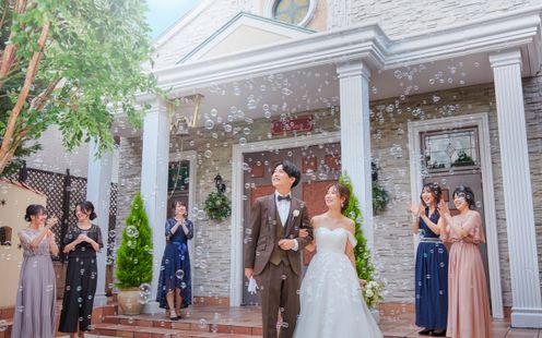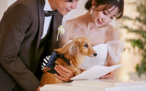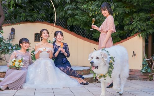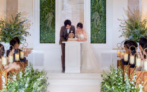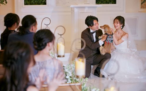 ガーデンに隣接する真っ白な独立型チャペル。2フロア分の天井高を誇るので開放的で、音響効果も抜群です。ライティング効果によってチャペル内を印象的にアレンジできるのでシーンにあわせて表情を変えられます。また、ペットと一緒にセレモニーも可能でリングドッグ演出や肉球スタンプの証明書などふたりの誓いのシーンを可愛い愛犬とともに過ごすことができます。挙式後は青空のもとでフラワーシャワー、ブーケトスなどのアフターセレモニーをお楽しみいただけます。