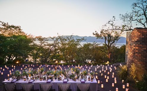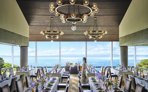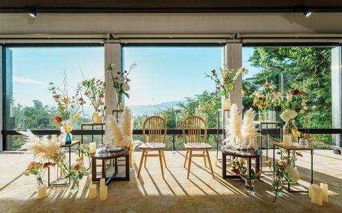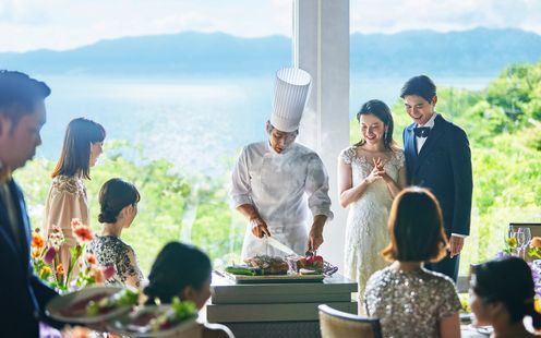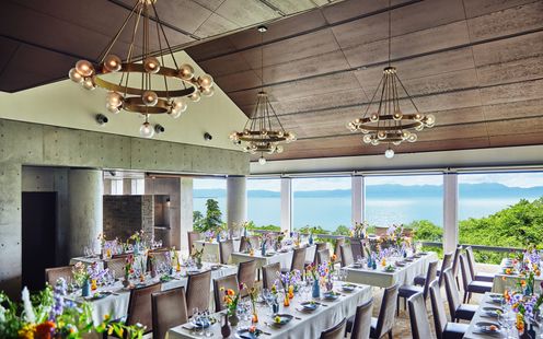 どの席からも窓の外に広がる緑と琵琶湖の美しい風景を望むことのできるパーティ会場。まるでおふたりの別荘に招いたようなあたたかみを感じる、贅沢で居心地のよい空間です。大自然に囲まれながら、時間を忘れてゆったりとお過ごしいただけます。