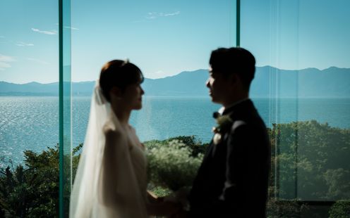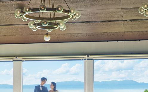 青い空と陽光を受けてきらきらと輝く琵琶湖を正面に望むチャペル。美しい景色と光が織りなす清らかな空間は生涯の誓いの場にふさわしく、息を吞むほどに感動的なシーンとなります。※着席80名まで