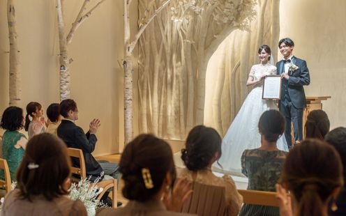 チャペル上部を樹木や枝・葉で覆われたかのような「森のチャペル」。木漏れ日がバージンロードに差し込む光の演出は幻想的で、誓いのシーンがより印象的に。まるで小鳥のさえずりが聞こえてきそうな心地よい空間です。モチーフである白樺が意味する木言葉は「家族」「母」。これまでの感謝とこれからの明るい未来を紡ぎ、心がひとつになる感動のセレモニーが叶います。挙式後、大階段では華やかなフラワーシャワー等の演出が、雨天時でも気にすることなく楽しめるのも魅力です。