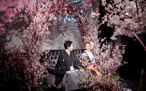 桜の花の中で結婚式。着物のゲストに囲まれれば、時代絵巻に描かかれるような雅やかな雰囲気が漂います。