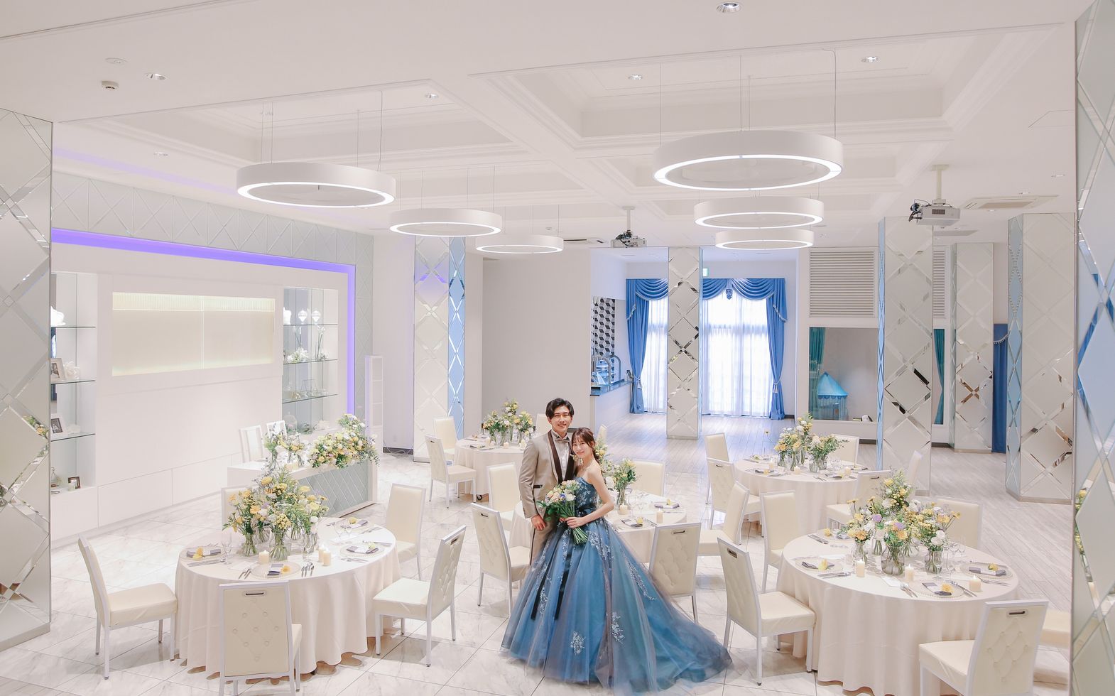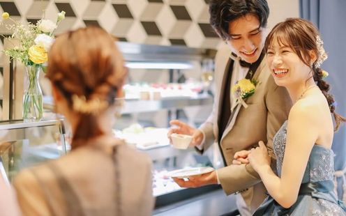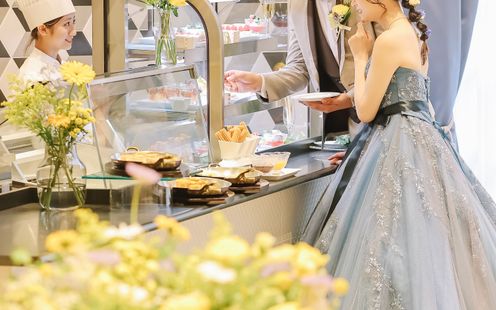 県内でもめずらしい、水の都・大垣をイメージして、ふたりの座るメインテーブルの後ろからバブルの文字が浮かび上がります。花嫁が美しく映える白を基調とした空間にはナチュラル感たっぷりのガーデンが併設され、アットホームなウエディングが叶います。女性ゲストに人気なのが「スイーツマルシェ」。ムースやケーキ・タルトなど季節に応じたデザート、アイスクリームバーなど様々な種類のスイーツが市場のように会場を彩ります。また、会場内にはお子様連れのゲストに安心していただけるキッズルームをご用意。ガラス張りでお子様の様子が見えるから親御様も安心してゆっくり過ごせると好評です。