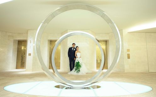 真っ白なホワイエは特別な1日を過ごすのにふさわしい贅沢な空間。リングをモチーフにした巨大オブジェは絶好のフォトスポットに!