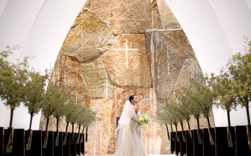 デザイナー・橋本夕紀夫氏設計によるデザイナーズ空間。天井高は約7mにおよび、白壁の曲線が織りなす荘厳な雰囲気が魅力。 祭壇には最高級天然石である庵治石がダイナミックに配され、表面を流れる水の音が心を癒してくれます。水のせせらぎとハープやオルガン、バイオリン、聖歌隊の調べが響き渡る中、 「母なる自然」をテーマにしたぬくもりあふれる空間で、厳かであたたかなセレモニーを。この美しい空間で印象的なファミリーミートも叶います。