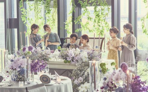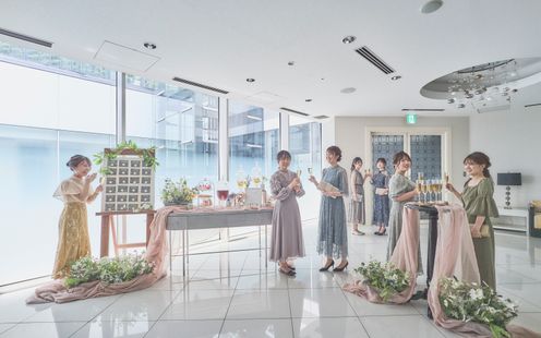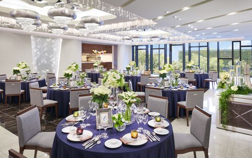 オープンキッチン付きの緑・光が彩るバンケット。ふたりのパーティに専属のシェフがつき、ゲストへこだわりのメニューを紹介いたします。ホワイエではフィンガーフードやドリンクサービスのおもてなしを。プライベート感溢れるパーティが叶います。