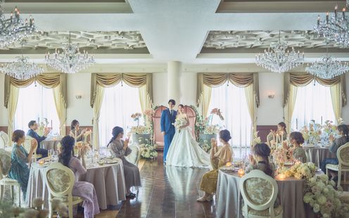 天井高7m、白大理石のバージンロードの長さは20mにおよび、自然光が優しく差込むチャペル。ブルーのステンドグラスには幸運を招くラピスラズリや、真実の愛を貫くパワーを持つアメジストがあしらわれ、ふたりの誓いの瞬間を見守ります。バージンロードはロイヤルブルーのカーペットで彩ることも可能です。純白のウェディングドレスが美しく映えるので好みを選んでみて。また、挙式のクライマックスには、大切に育ててくれた家族へ感謝を伝える「ローズトゥファミリー」「ファミリーオース」のセレモニーが行われます。「絆」を大切にした感動的なシーンがゲストの心にも刻まれるはず。さらにペット参列についても気軽にお問い合わせください。