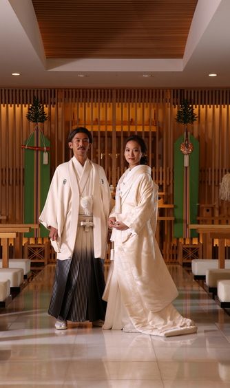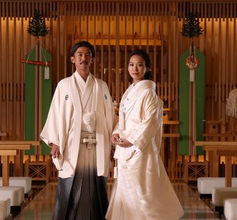 大理石をあしらった本格神殿で日本伝統の儀式を行う神前式を!和装での前撮りもOK