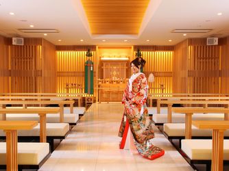 木の素材に囲まれた温かみに包まれた本格神殿。椅子がソファ席のため、年配ゲストにもくつろいで参列いただけます。鳥居をイメージしたエントランスは幻想的な光によって、より厳かな雰囲気を醸し出しています、当日チャペル挙式でも、和装前撮りもお愉しみいただけますので気軽にご相談ください。