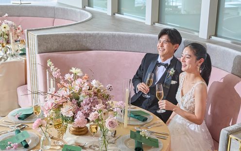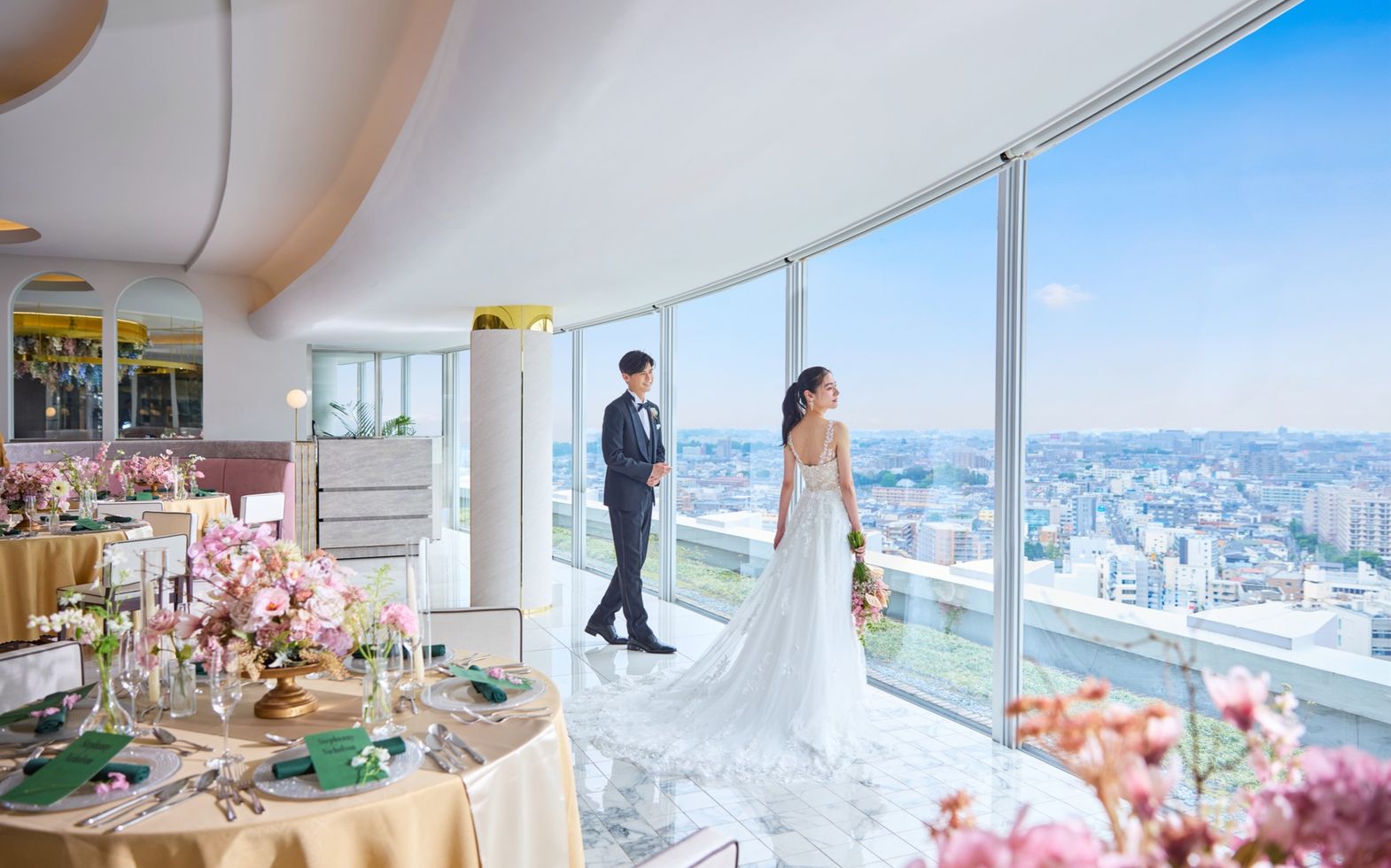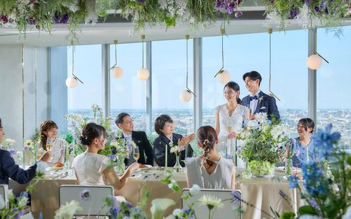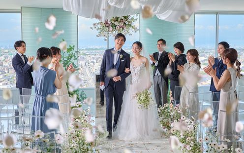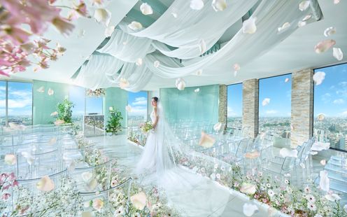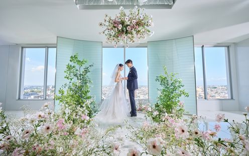 眼下に都会の景色を一望する眺望抜群の天空のチャペル。絶景のパノラマビューが彩る演出でより感動的なセレモニーが叶います。家族や親しい友人との特別な瞬間を、時間とともにうつりゆく情景がドラマチックに祝福します。