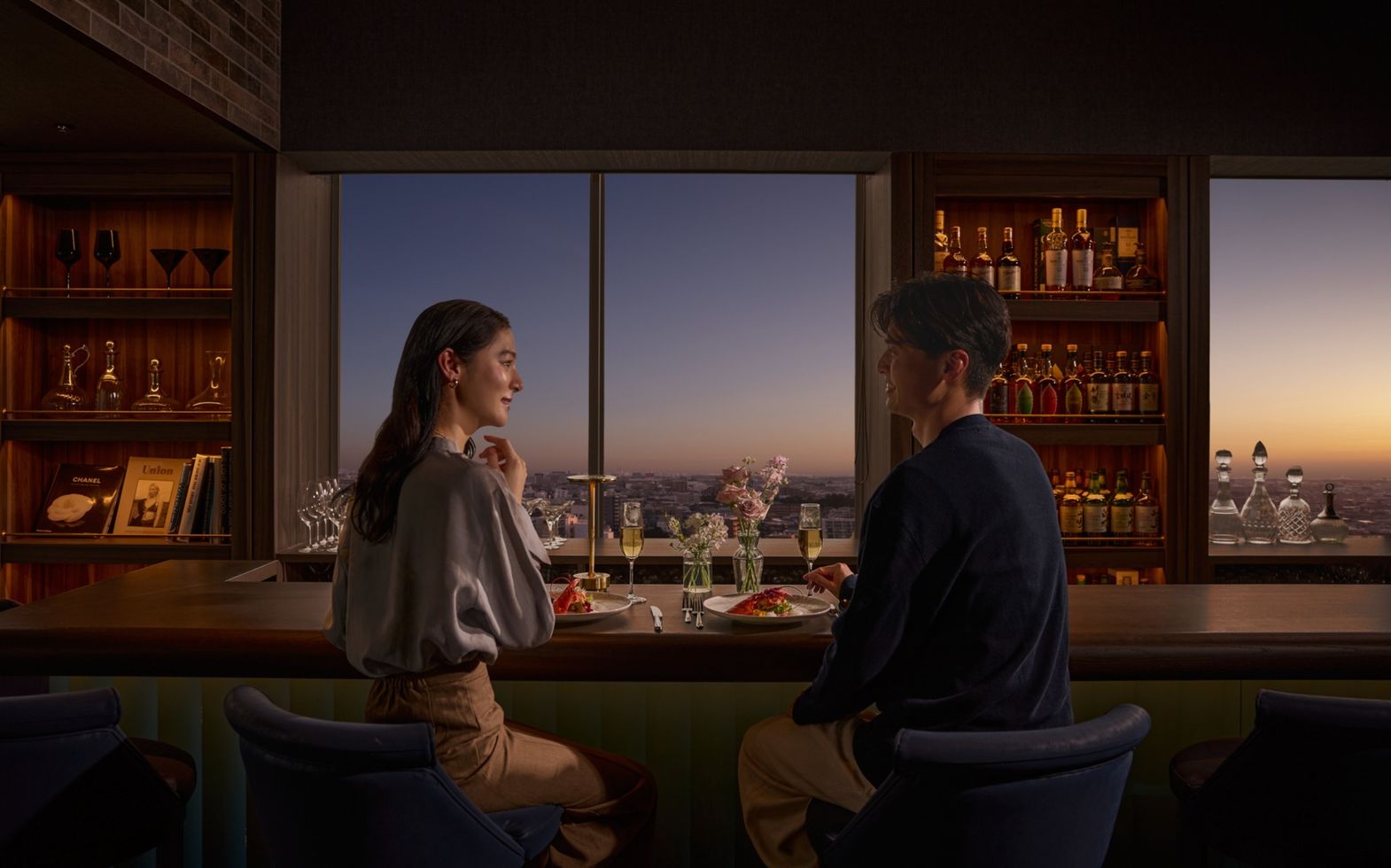 昼から夜へ移り変わる景色とともにふたりらしい世界観のコーディネートを愉しんで