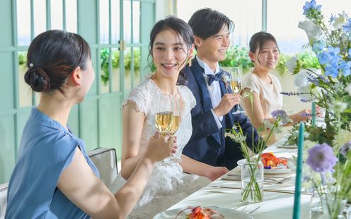 2会場の中から、好みのスタイルで理想のパーティを。家族とアットホームな時間を過ごしたいふたりには「スカイルーム」がおすすめです。ひとつのテーブルをゲストみんなと囲んで食事と会話の弾むひとときをお過ごしいただけます。