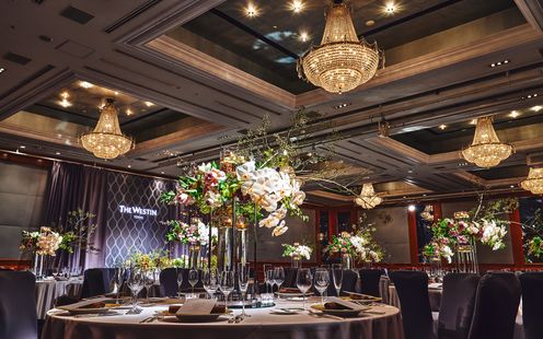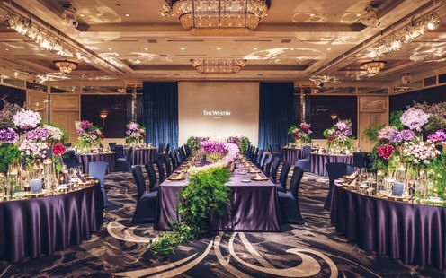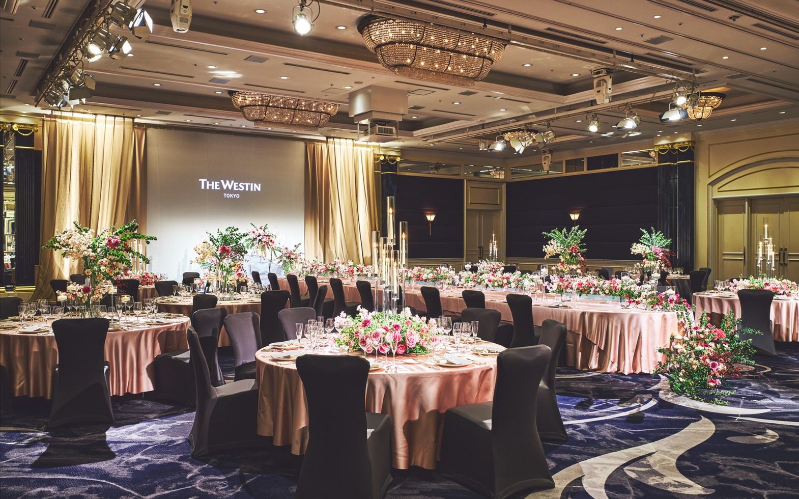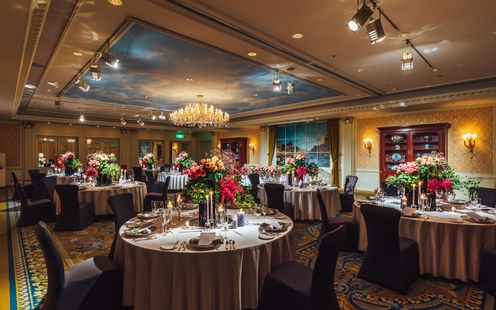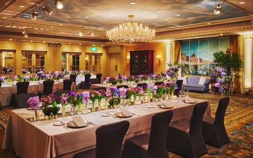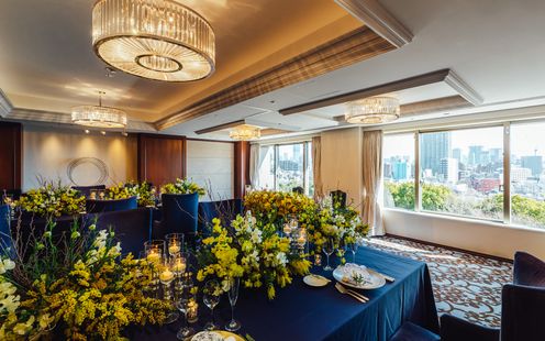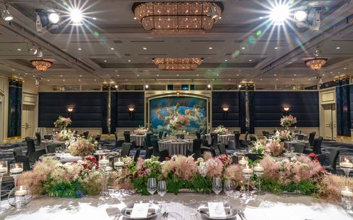 高貴なロイヤルブルーのインテリアが ラグジュアリーな雰囲気を醸し出す ウェスティンホテル東京のメインバンケット。晩餐会スタイルのレイアウトも映える大空間で正統感あふれるパーティを。※推奨人数80名様以上(ただし、お日柄によっては70名様以上の相談も受付)
