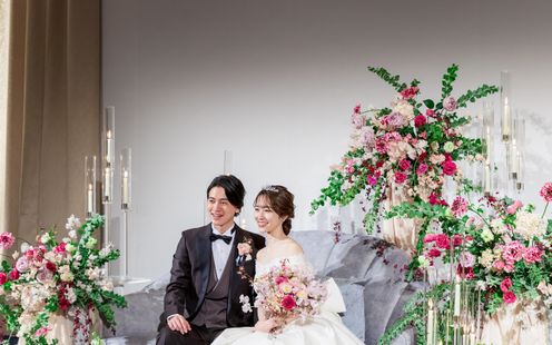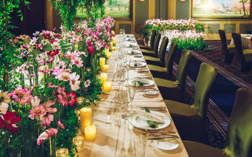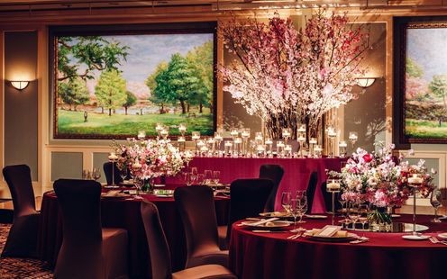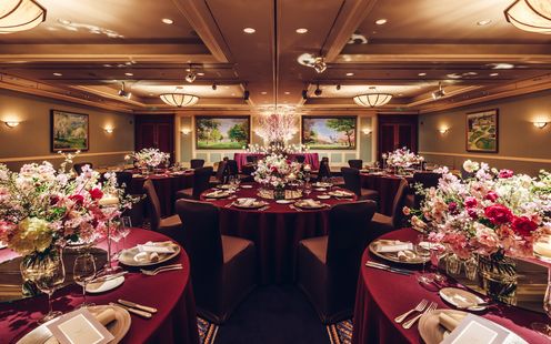 旅立ちと新たな始まりの季節。ふたりの新たな人生の門出にふさわしい春を象徴する桜が四季を通じて咲き誇るギャラリー風バンケット。会場全体が上品なかわいらしさと優しい雰囲気に包まれ、ドレスも和装も花嫁の美しさを可憐に引き立てます。テーブルレイアウトは円卓テーブルでも、長いテーブルの設置でもふたりの希望に沿ってアレンジいたします。