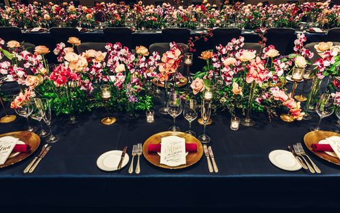 ウエディングパーティを華やかに彩るフラワーアレンジメント。