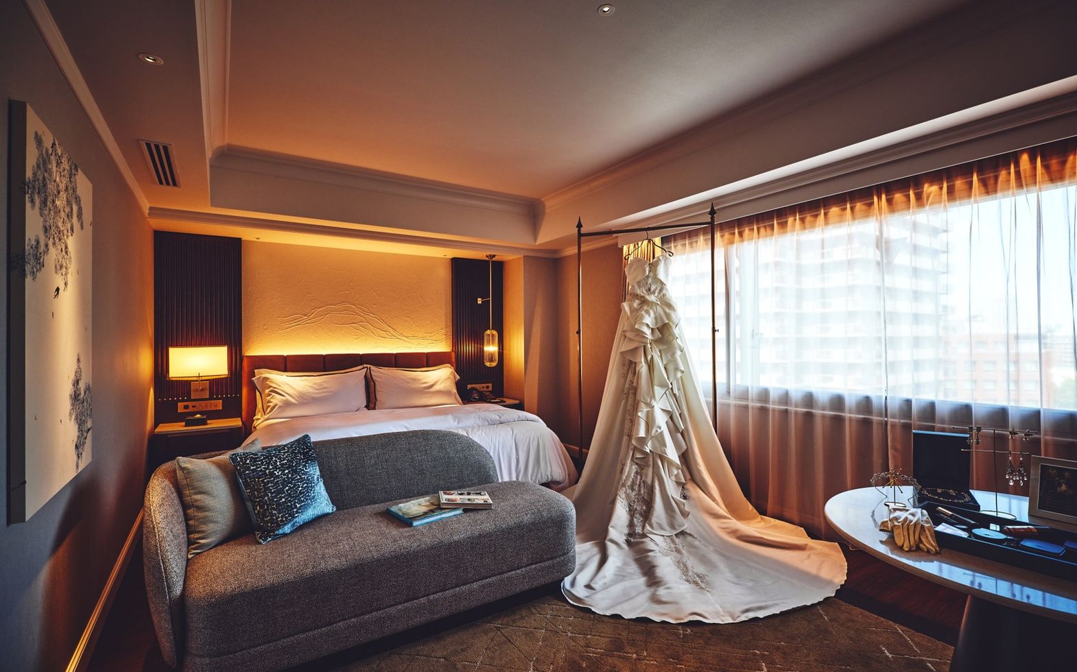 自然光が差込む客室でリラックスしながら支度ができる「ブライズルーム」。花嫁姿への準備は、専用キーが無いと入れない客室を用意。部屋に入ると、たくさんの時間をかけて選んだドレスがお迎えします。スキンケアから念入りに時間をかけて花嫁姿になれる特別な一日をお届します。