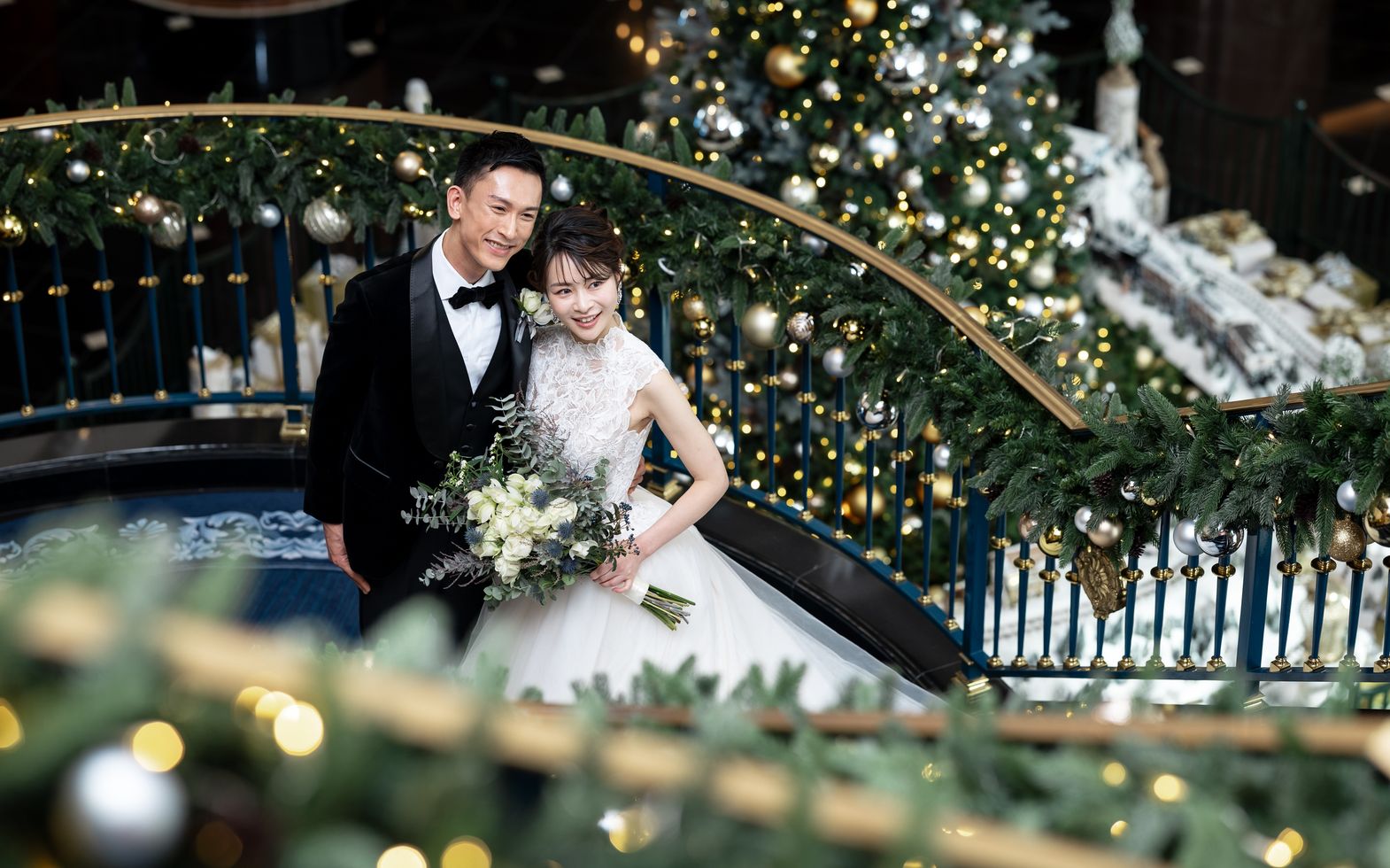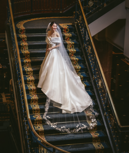 ロングトレーンのドレスが映えるエントランスロビーから続くらせん階段はフォトジェニックなスポットです。花嫁が美しく際立つ空間なので、想い出の一枚はおさえておきたい場所として人気を博しています。