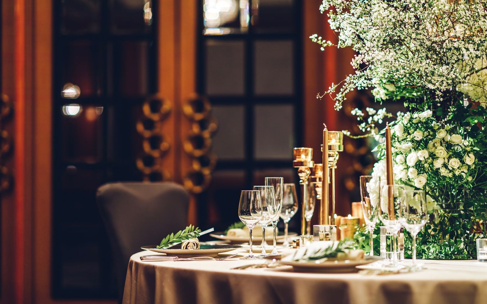 窓の向こうに広がるヴェネチアの美しい景観は 16世紀のヨーロッパで流行した精巧なトロンプルイユ。シャンデリアの眩い輝きの下 貴族の邸宅さながらの優雅な空間で 忘れられないひとときをゲストと共にお過ごしください。