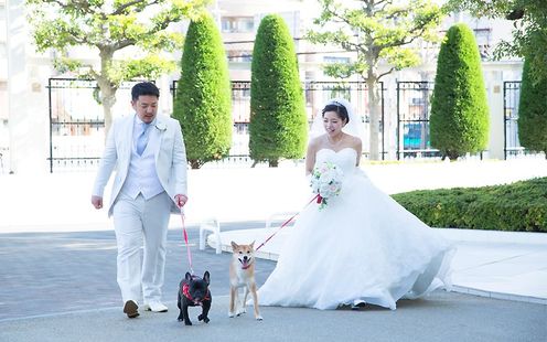 シーンごとに輝きを変えることができるガラスのバージンロードが印象的。挙式後は、緑がいっぱいのレンガがあしらわれた広場でゲストとの笑顔あふれるアフターセレモニーもお愉しみいただけます。また、リングドッグ演出などペットと一緒に挙式が叶いますので詳しくはお問合せください。
