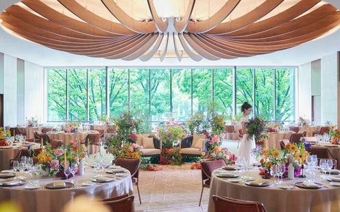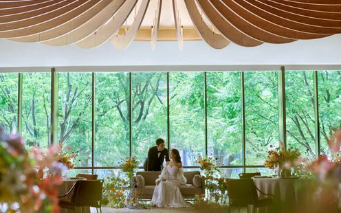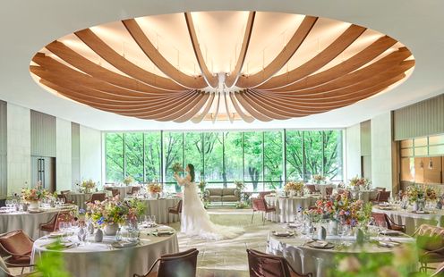 やすらぎと心地よさを追求し“アドバンスサンルーム”をコンセプトとして設計された会場「Park View South」。陽光をモチーフにデザインした天井のライトがおふたりとゲストにあたたかな光を降りそそぎます。足元には土や砂をイメージした絨毯を敷き、明るさのなかにも落ち着きのある雰囲気を演出。インテリアを優しいウッド調でまとめて窓の向こうの緑と調和する空間をつくりだしました。ナチュラルやアットホーム、エレガントなどどんなスタイリングも美しく映えるのでおふたりの思いのままに憧れの世界観を表現できます。