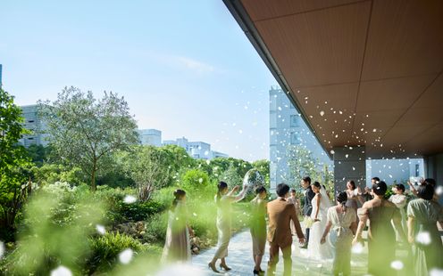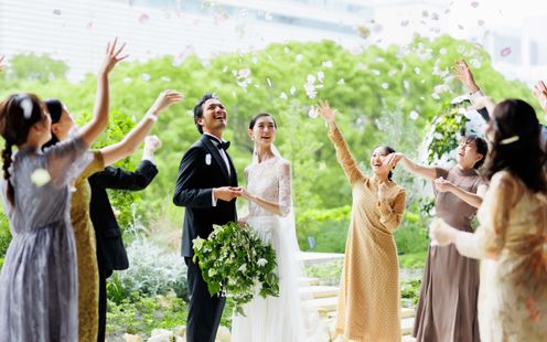 TIADのチャペル前にはアフターセレモニーのスペースがございます。青い空、久屋大通公園の豊かな緑、心地よい風。緊張が解けたおふたりをゲストの歓声とフラワーシャワーの演出が待っています。
