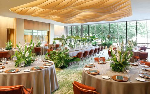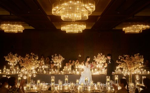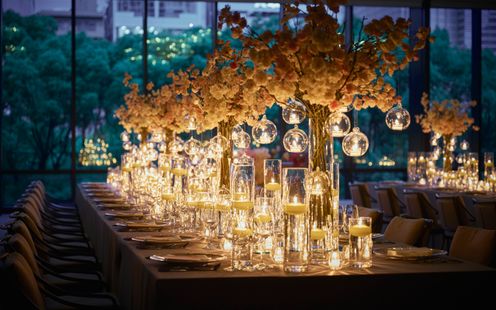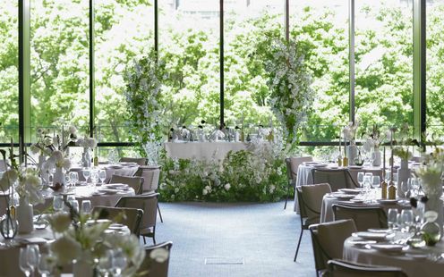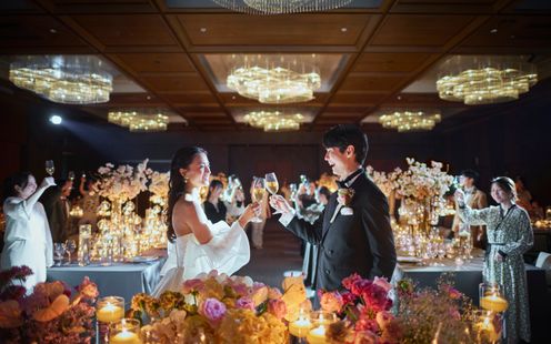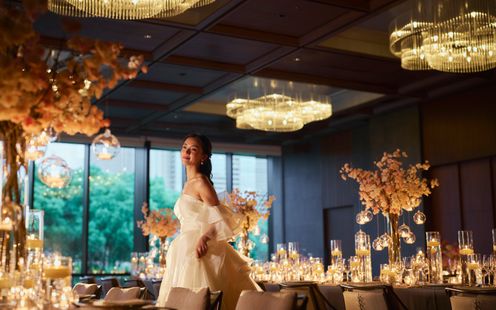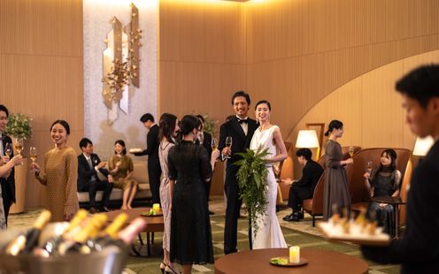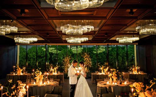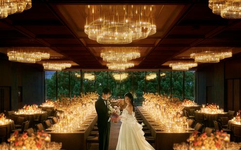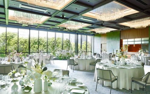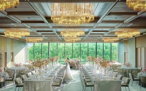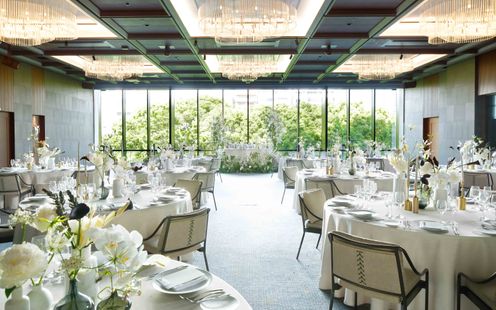 世界各国のVIP が集う国際会議の会場としても使われる「Queens Room」。“アドバンスメゾン”をコンセプトに自然素材をモダンにアレンジしてコンテンポラリーな空間をつくりあげています。日本建築の技法を取り入れた格天井にはシャンデリアが輝き、海外から訪れたゲストの目を楽しませる意匠に。また幅広い年齢層の方々にファーストクラスの寛ぎを感じていただけるようゆったりと落ち着いた環境を整えています。ワンフロア貸切という贅沢と、最高のおもてなしを。上質なホテルウエディングをお約束いたします。