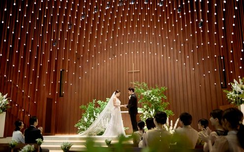 森に守られた〔巣〕を思わせる、あたたかみあるチャペル。2500個ものライトがふたりを彩る