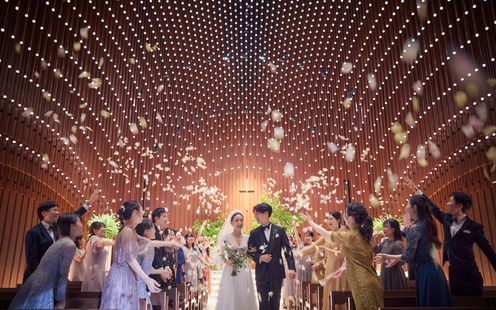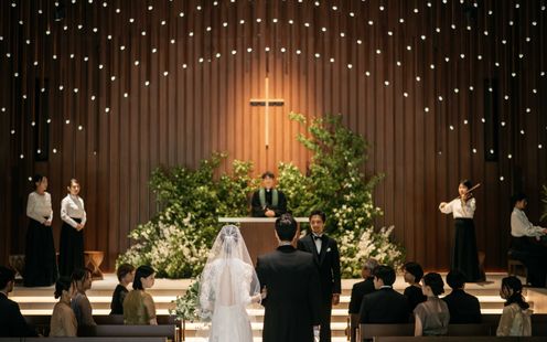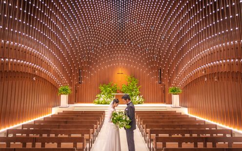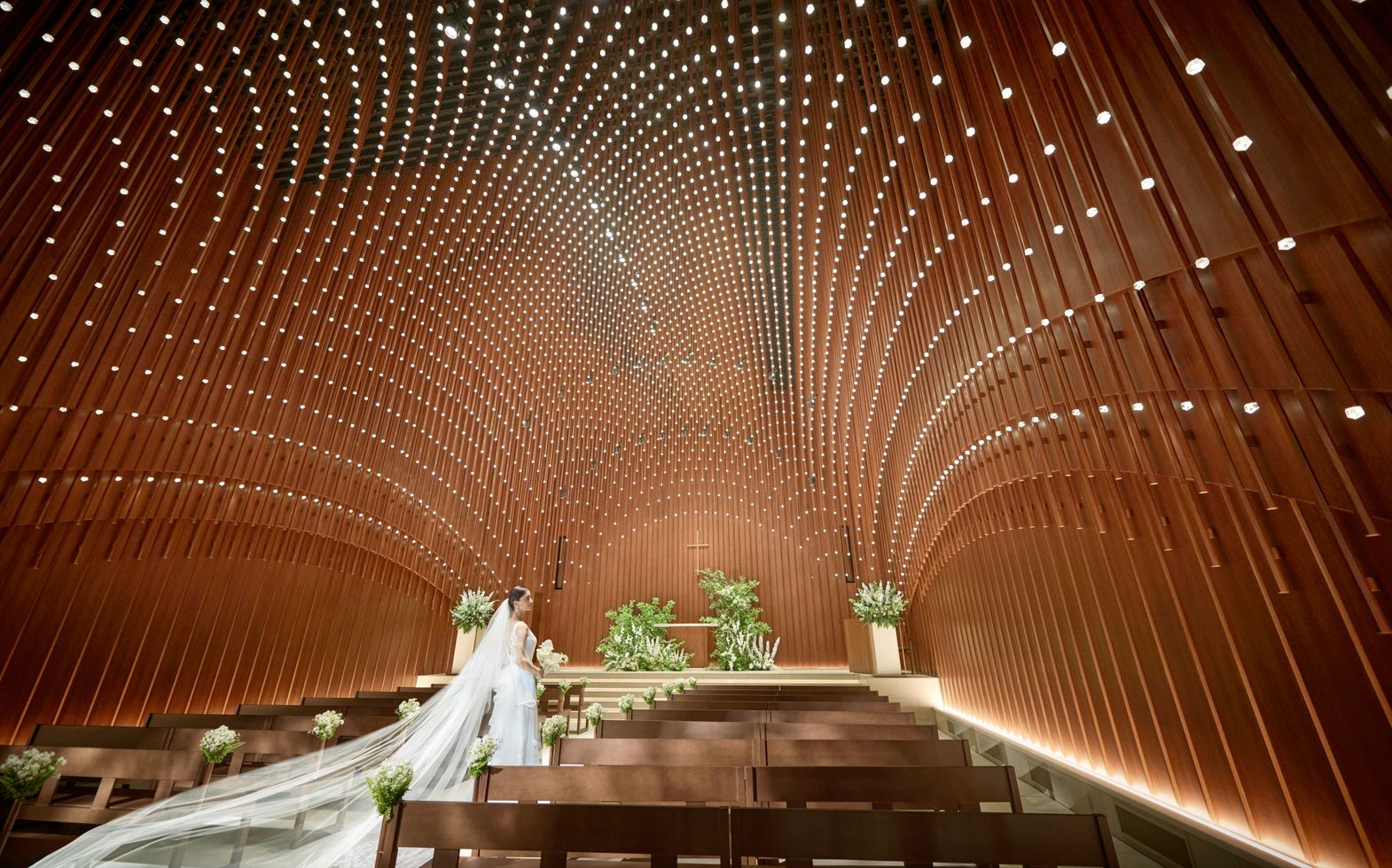 森のなかの“NEST〔巣〕をコンセプトにした、温もり溢れるチャペル。木々のあたたかさを感じられる意匠は、大樹のもとでの挙式をイメージしてデザインされたものです。10m以上の高さを誇るアーチ型の天井に輝くのは、2500個ものライト。長いバージンロードを歩く花嫁を木漏れ日のような優しい光で包み込みます。聖歌隊の歌声や生演奏の音色も美しく響く大空間で、喜びの瞬間をお迎えください。