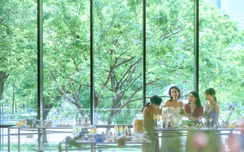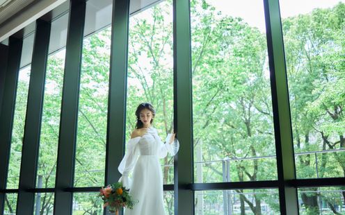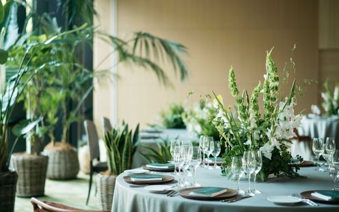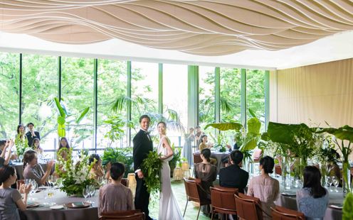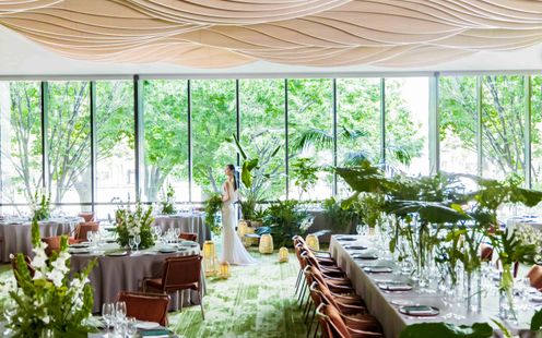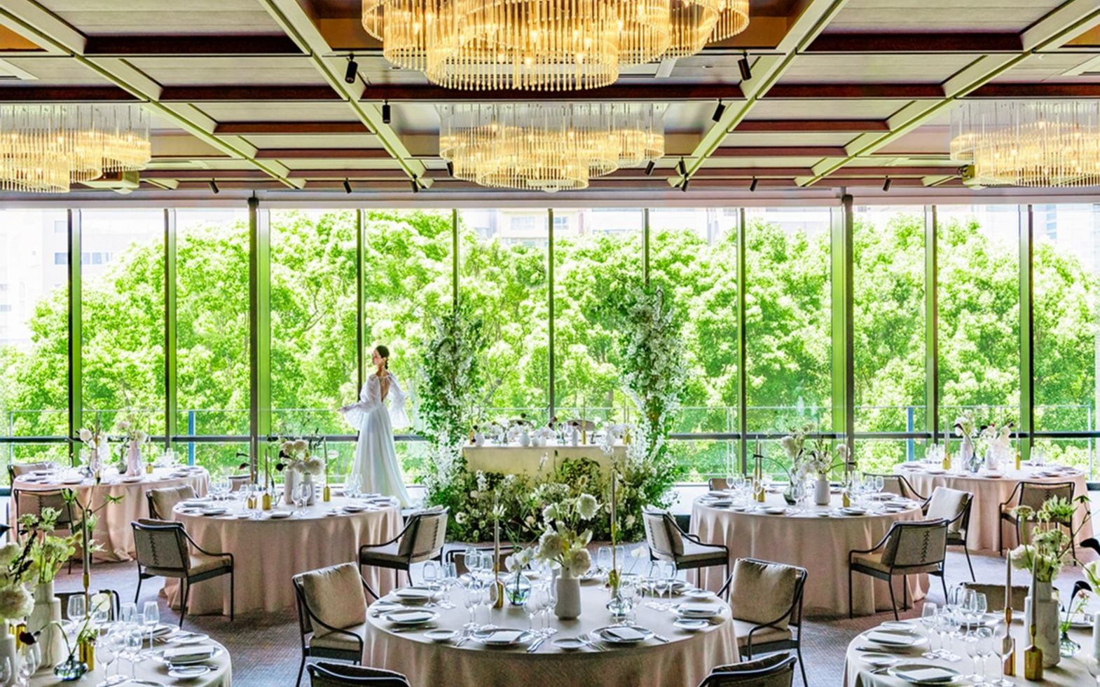 “アドバンスフォレスト”をコンセプトにした爽やかな会場「Park View North」。森の植物や木漏れ日など、癒しを感じられる自然のエレメントをイメージして空間をデザインしています。すぐ目の前には、久屋大通公園の豊かな緑。印象的なアートワークを施した天井照明はその公園を吹き抜けていく風をモチーフとしたものです。また絨毯に木々の柄を描いたことで窓外の緑景と一体化したような世界観に。室内にいながらも、森に包まれる感覚を味わえる寛ぎのパーティを叶えます。