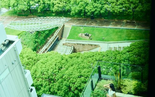 久屋大通公園の緑を取り込むような入れ子上の造り。景観を崩さない上質な佇まい。