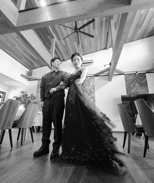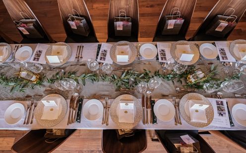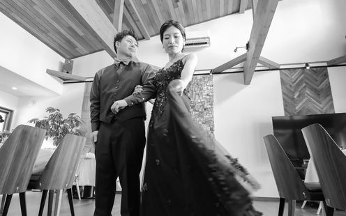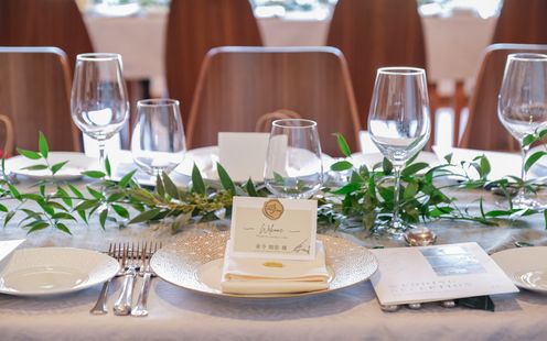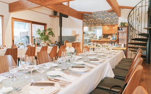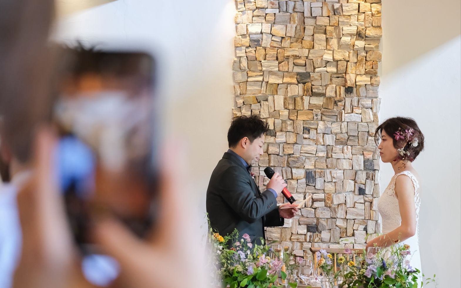 レストラン内で行う人前式は、ゲストを近くに感じられるアットホームな雰囲気に。1000年の時を経て化石となったマダガスカルウッドストーンのアクセントウォールの前で行われる誓いは、永遠を感じさせる雰囲気を醸し出します。