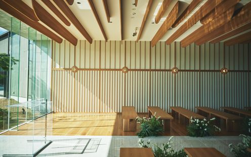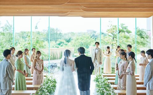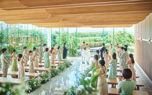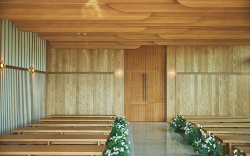 福島の自然、景色、雄大さを感じてほしいとの想いから2面ガラス張りの開放的な設計に造られているチャペル。空間デザインも自然と調和するように木目調のナチュラルな内装で統一されています。挙式はキリスト教挙式・人前式・神前式が叶います。家族の絆を感じるアットホームなセレモニーを。
