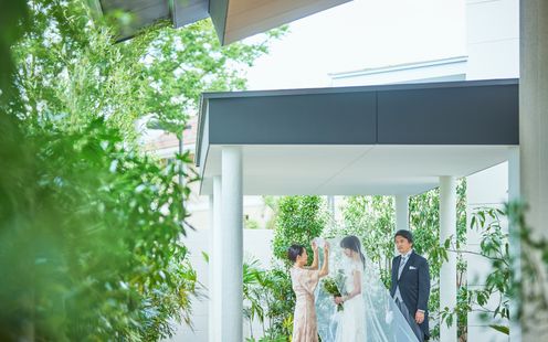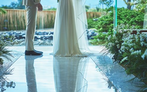 まるでリゾートホテルを訪れたかのような庭園を一望できる開放的なラウンジ。桜吹雪の様子を表現したガラスアート、水平と垂直がバランスよく調和した和の建築美、切妻造りの吹抜け屋根など、見るものを飽きさせない上質な空間をすべてふたりの我が家のようにご利用いただけます。ジャパニーズモダンな装いのデザイナーズ空間でゲストをおもてなしいたします。