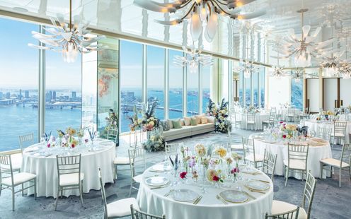 スカイバンケットは、<SKY CHAPEL>と同じフロアにあるのでお招きしたゲストに移動の負担をかけず、動線がよい点もポイント!<THE SEA>は、全面ガラス張りの窓から自然光が溢れる広々とした空間でウェディングドレスをまとう花嫁をより美しく魅せてくれます。また、会場内にはオープンキッチンも完備されており、絶景&出来立ての料理でふたりの大切なゲストをおもてなしいたします。