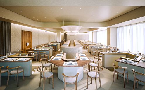 「Immersive table(イマーシブテーブル)」というコンセプトのもと、象徴的なカウンターテーブルを設えています。上座や下座が無く、全員が特等席に招かれているような設計は、ゲストが主役だと感じられる体験に。1テーブルに一名、専属のサービスマンを配置し、ふたりに代わってゲストへ最上級のおもてなしを提供します。さらに、厨房の一部が、パーティールームの中央にせり出すデザインになっており、料理が仕上がる様子を間近で体感可能。作り手の姿や想いが見え、料理を一つのエンターテイメントとして楽しむことができます。※会場全景、完成予想図